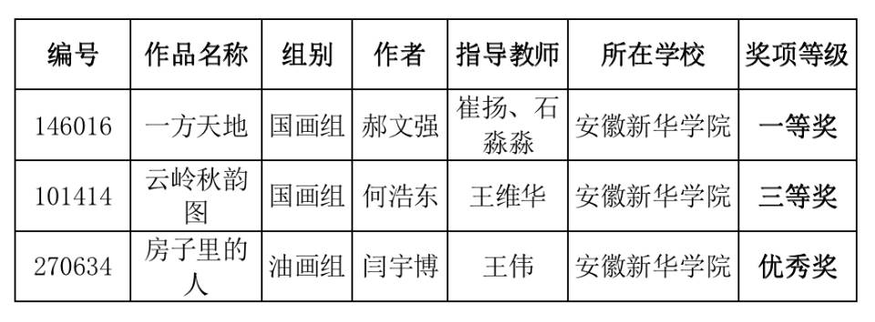 其中,崔扬、石淼淼老师指导的学生郝文强获国画组一等奖,王维华老师指导的学生何浩东获国画组三等奖,王伟老师指导的学生闫宇博获油画组优秀奖。