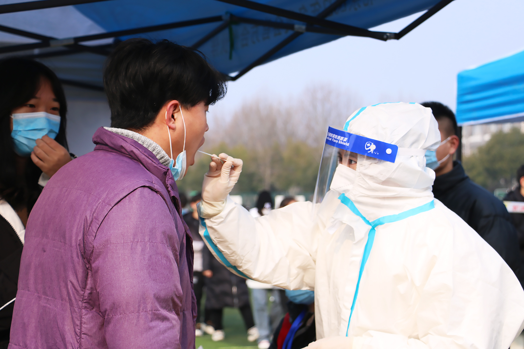 本次核酸检测覆盖我校所有在校学生和教职员工,做到应检必检、全员覆盖,确保不漏一人。在检测现场,医护人员穿着密闭的防护服,严格按照采样流程规范操作;学校工作人员积极维持现场秩序,核对学生信息、引导师生有序排队,全力协助做好核酸检测的保障服务工作。受检人员保持安全距离,有序排队,接受样本采集。辅导员全程陪同学生检测,检测秩序井然。