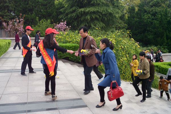 上午9时整,20余名消防志愿者从学校出发,首先来到烈士陵园,分别向过往的祭扫人员发放防火宣传单同时还提醒市民注意祭祀期间的防火工作,倡导文明祭扫,用植树、送花等有益于保护生态环境的文明方式开展祭奠活动,之后又前往大蜀山盘山公路、旅客乘凉的树林中等,有的向游客宣传防火知识,有的制止少数游客吸烟行为,有的提醒游客注意安全等。此举得到了广大游客的大力支持和广泛赞许。