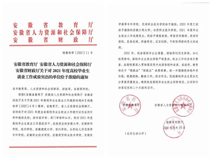 本网讯(通讯员:孙珊珊)近日,安徽省教育厅、安徽省人力资源和社会保障厅、安徽省财政厅联合印发《关于对2021年度普通高校毕业生就业工作成效突出的单位给予激励的通知》(皖教秘学〔2022〕11号),表彰2021年度普通高校毕业生就业工作成效突出单位(共10所高校,其中本科高校5所)。我校获此殊荣,并获激励资金30万元。
