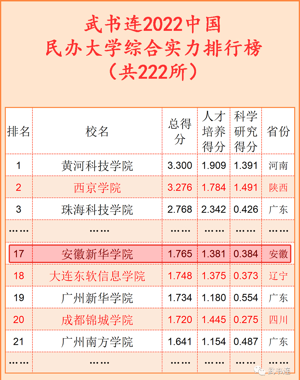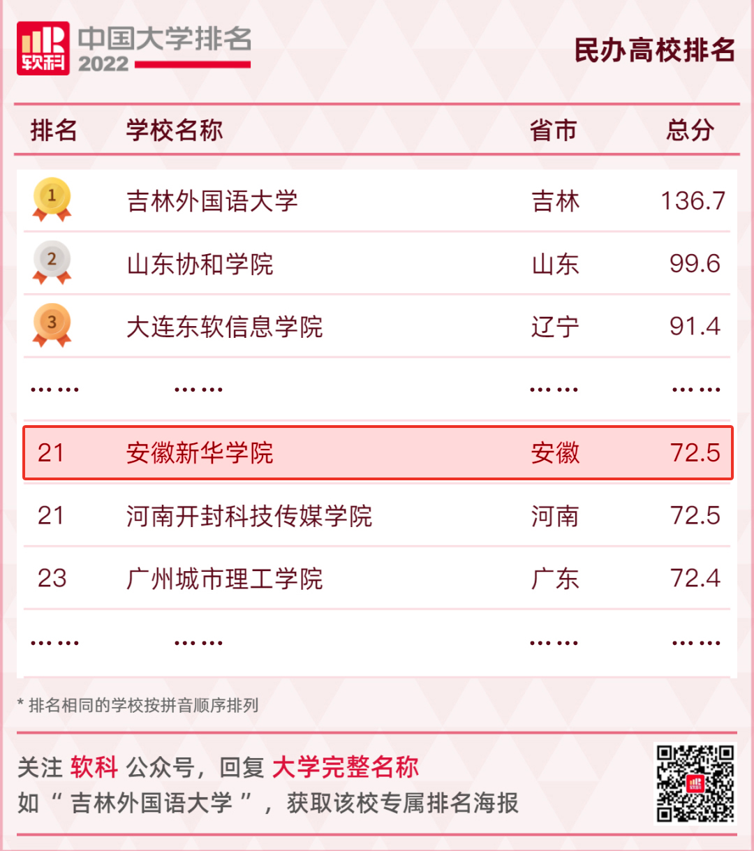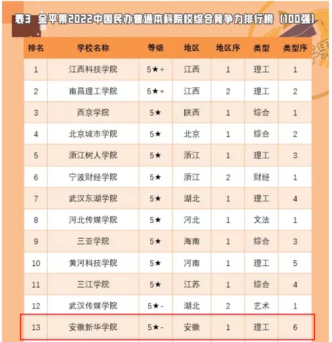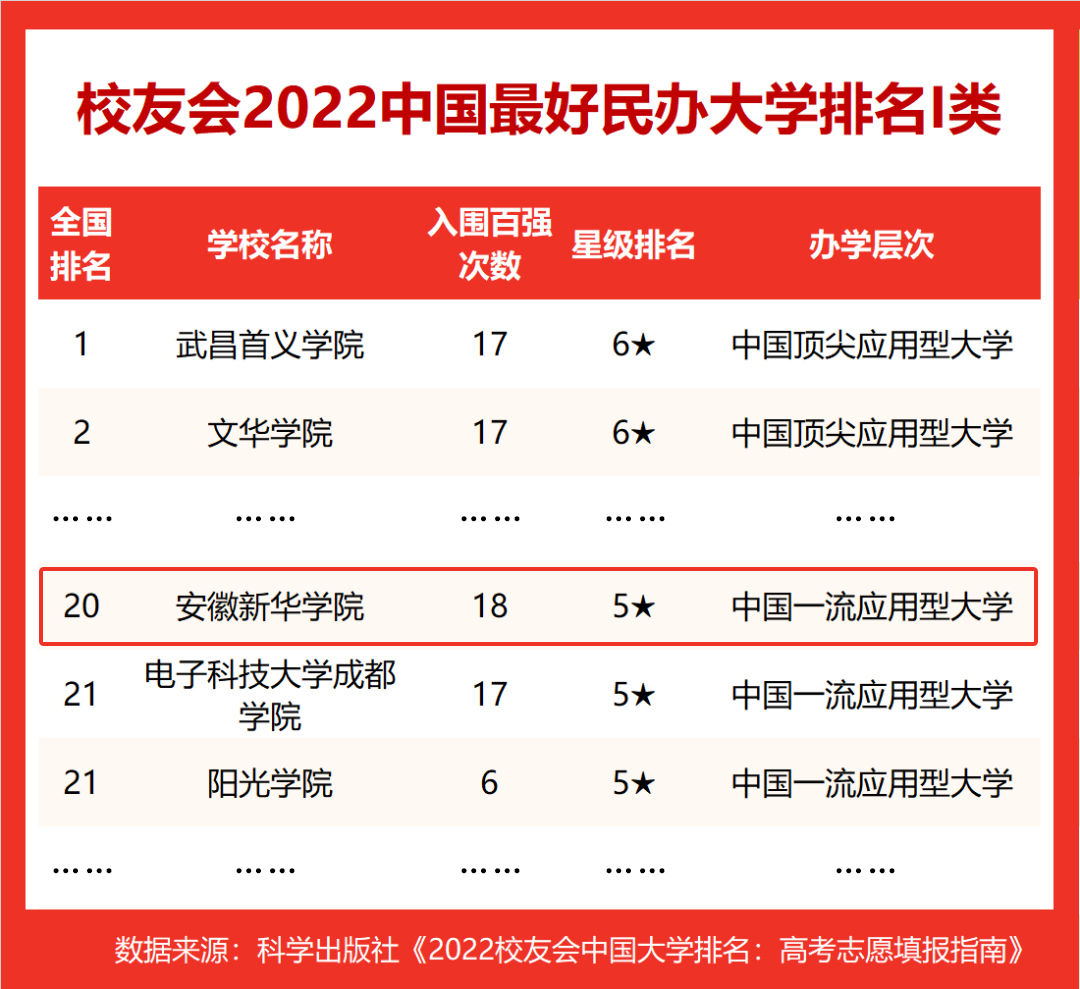 近日,2022中国大学四大主流排行榜(软科 校友会 武书连 金平果)发布,安徽新华学院均位列安徽省民办高校榜首。