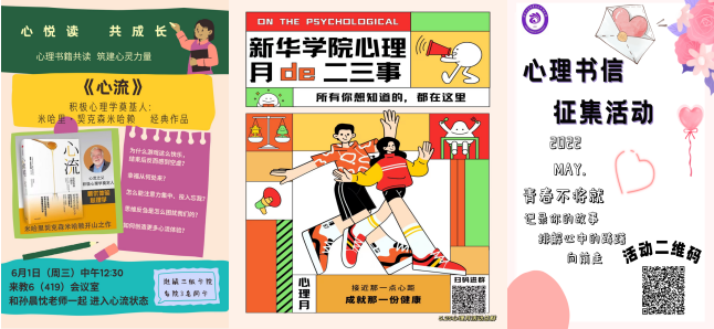 活动月期间,心理健康教育中心联动各学院心理工作站开展学院特色心理活动,扩大心理知识宣传普及覆盖面,通过开展第四届“心之微拍”心理健康教育公益广告微视频大赛、“疫”起创意,“罩”亮生活口罩创意设计大赛、“定格幸福瞬间”摄影大赛、“云贴贴”带你走进心理中心、“心悦读”读书会、心理书信征集等内容丰富的活动,激发学生主观能动性,从“动手、动脑、动情”入手,让同学们在实践中体验和激发积极的心理能量。