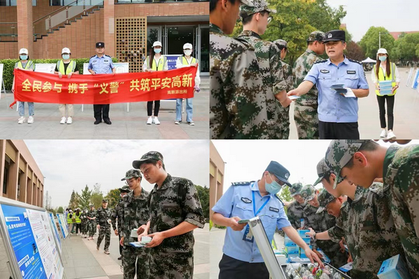 集中辅导培训结束后,派出所民警与高新义警们走近正在参加军训的大一新生训练场,组织观看防电诈知识展板、开展禁毒知识宣讲、发放安全知识宣传单页。