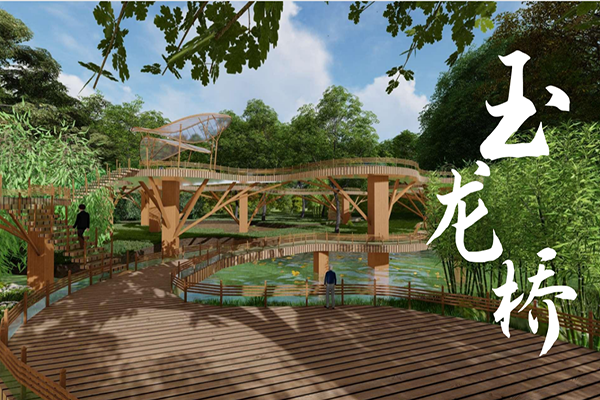 “玉龙桥”选址合肥市逍遥津公园,将三国元素融入到设计中,极具特色。作品在创作上加入了创新元素和环保元素,呼应了大赛主题,同时也响应了党的二十大报告中提出的“要积极推动绿色发展,促进人与自然和谐共生”的发展理念。