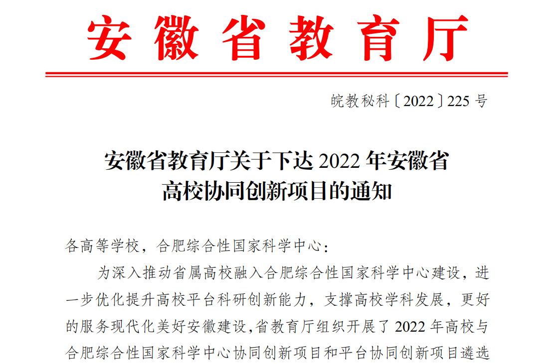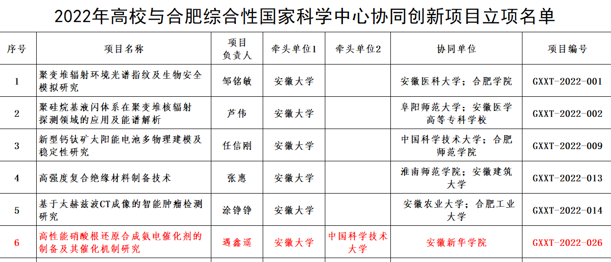 本网讯(通讯员:赵影)11月28日,安徽省教育厅发布了《安徽省教育厅关于下达2022年安徽省高校协同创新项目的通知》,我校药学院赵颖博士协同申报的课题《高性能硝酸根还原合成氨电催化剂的制备及其催化机制研究》获得立项批准。该项目是由安徽大学和中国科学技术大学牵头申报,我校为协同合作单位,项目实施周期为2-3年。