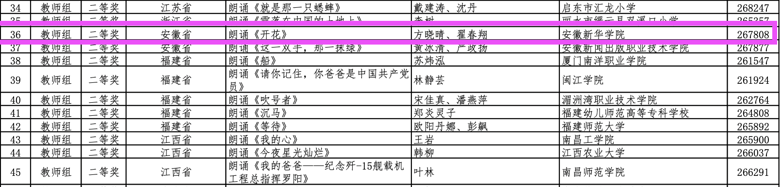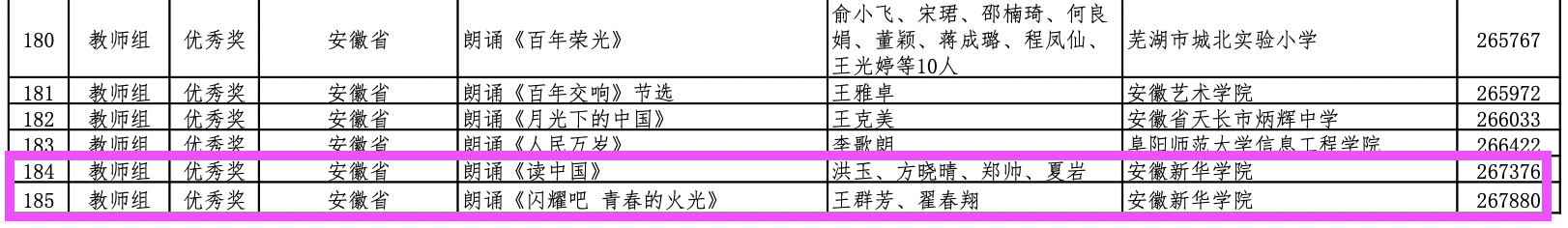 第四届中华经典诵写讲大赛“诵读中国”经典诵读大赛从4月启动以来,全国省级部门选拔推荐和专家评审,7个组别3754个视频作品入围全国复赛、1370个作品入围决赛,330个作品入围总决赛。我校教师组的方晓晴、翟春翔初赛作品《开花》披荆斩棘,突出重围,最终代表安徽省入围总决赛。在全国总决赛中两位老师声情并茂地朗诵诗歌作品《一片槐树叶》,情绪传达到位,将诗人思乡盼归的情感表达得淋漓尽致,并荣获全国总决赛二等奖。另外两组《闪耀吧青春的火光》(王群芳 翟春翔)、《读中国》(洪玉 方晓晴 郑帅 夏岩)获得总决赛优秀奖。