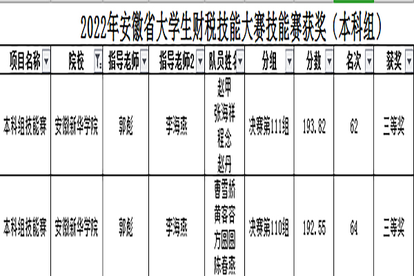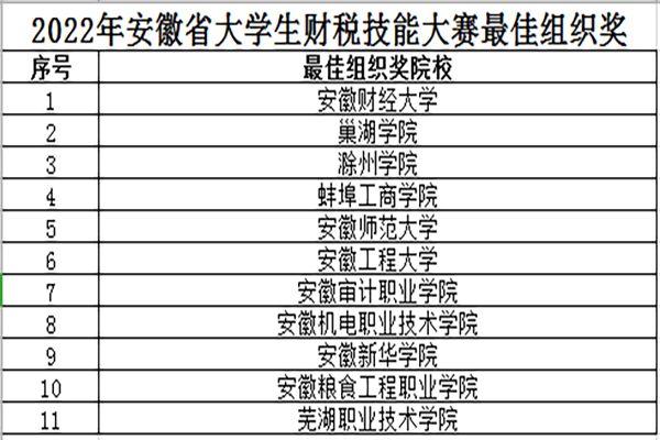 本网讯(通讯员:陈伟、夏敏)近日,2022年安徽省大学生财税技能大赛成功落下帷幕,我校财会与金融学院共有1支团队荣获省级一等奖,9支团队荣获二等奖,16支团队荣获三等奖,总获奖数量创学校在该项赛事中的最好成绩。同时,我校连续两年获赛事最佳组织奖。