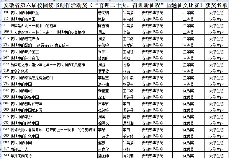 本网讯(通讯员:王青叶)由省委教育工委、省教育厅、省人力资源和社会保障厅、省文化厅、省新闻出版广电局、团省委主办的安徽省第六届校园读书创作系列活动结果公示结束。我校共获奖27人,其中一等奖1人,二等奖4人,三等奖8人,其余为优秀奖。 获奖名单如下: