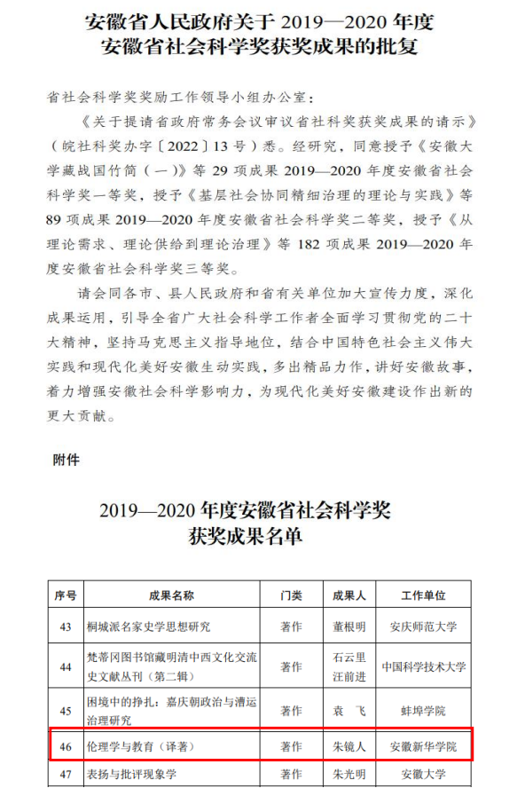 本网讯(通讯员:李彩平)日前,安徽省社科奖评奖办发布《省政府批复2019-2020年度安徽省社会科学奖获奖结果》。安徽新华学院大学生素质教育研究中心研究员朱镜人教授的译著《伦理学与教育》喜获安徽省社科奖三等奖。