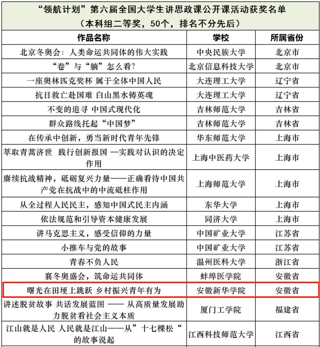 本网讯(通讯员:吴之娴)近日,由教育部高校思想政治理论课教学指导委员会主办、南开大学马克思主义学院承办的习近平新时代中国特色社会主义思想大学习领航计划主题教育“青春献礼党的二十大•强国有我新征程”——第六届全国高校大学生讲思政课公开课活动评选结果揭晓,我校马克思主义学院董丽娟、刘丽娟两位教师指导的学生作品《曙光在田埂上跳跃——乡村振兴 青年有为》荣获本科组二等奖。这是我校继第五届全国大学生讲思政课公开课活动获优秀奖之后再一次获奖,也刷新了学校参加本项赛事以来的最佳成绩。