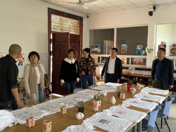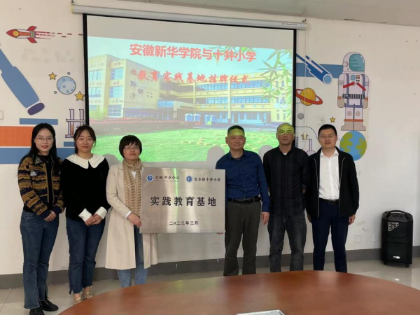 邵玲一行首先来到十井小学,杨庙中心学校校长徐庆卫、十井小学校长吴硕勇热情接待了邵玲一行。在两位校长的陪同下,邵玲参观了十井小学书画室、劳动教育基地等场所。学生书写的毛笔字帖、自己动手制作的以社会主义核心价值观为主题的文化衫、劳动教育基地学生制作的象棋、种植的蔬菜和校园的文化宣传氛围等体现了学校良好的素质教育成果。吴硕勇对我校前期对十井小学的帮扶工作表示感谢,尤其对我院师生以二十四节气为主题创作的绘画文化墙表示了肯定。随后双方围绕义务支教、志愿服务、心理辅导、劳动教育等交流合作内容进行了洽谈。最后邵玲和徐庆卫为“安徽新华学院—十井小学实践教育基地”揭牌,并进行合影留念。