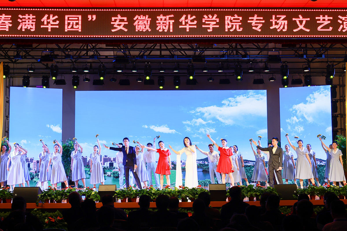 “四月芳菲春阳暖,踏歌起舞迎宾来。高朋满座话桃李,无限春光满华园!”与会嘉宾在校大礼堂观看我校师生专场文艺演出。一幕幕精彩的演出,演绎了23年来我校扎根江淮大地,秉持“厚德、求真、博学、创新”的校训精神,潜心耕耘结下的累累硕果;更展现了身处在新时代的大潮中,新华人与时俱进、开拓创新,在高等教育的大道上展现的活力青春。