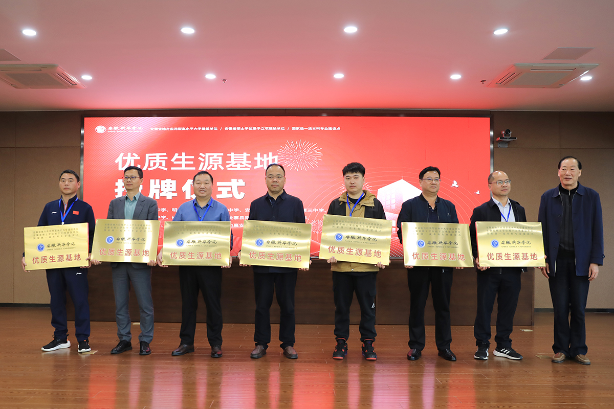 现场,校领导为淮南一中、孙疃中学、明光中学、宣城市第三中学、安徽师范大学附属庐江第三中学、芜湖市江南实验中学、矿建中学、禹王中学、金寨县南溪中学、六安独山中学、宣城市第十三中学、宣城市卓越补习学校、无为襄安中学、利辛高级中学十四所中学授予“安徽新华学院优质生源基地”称号。