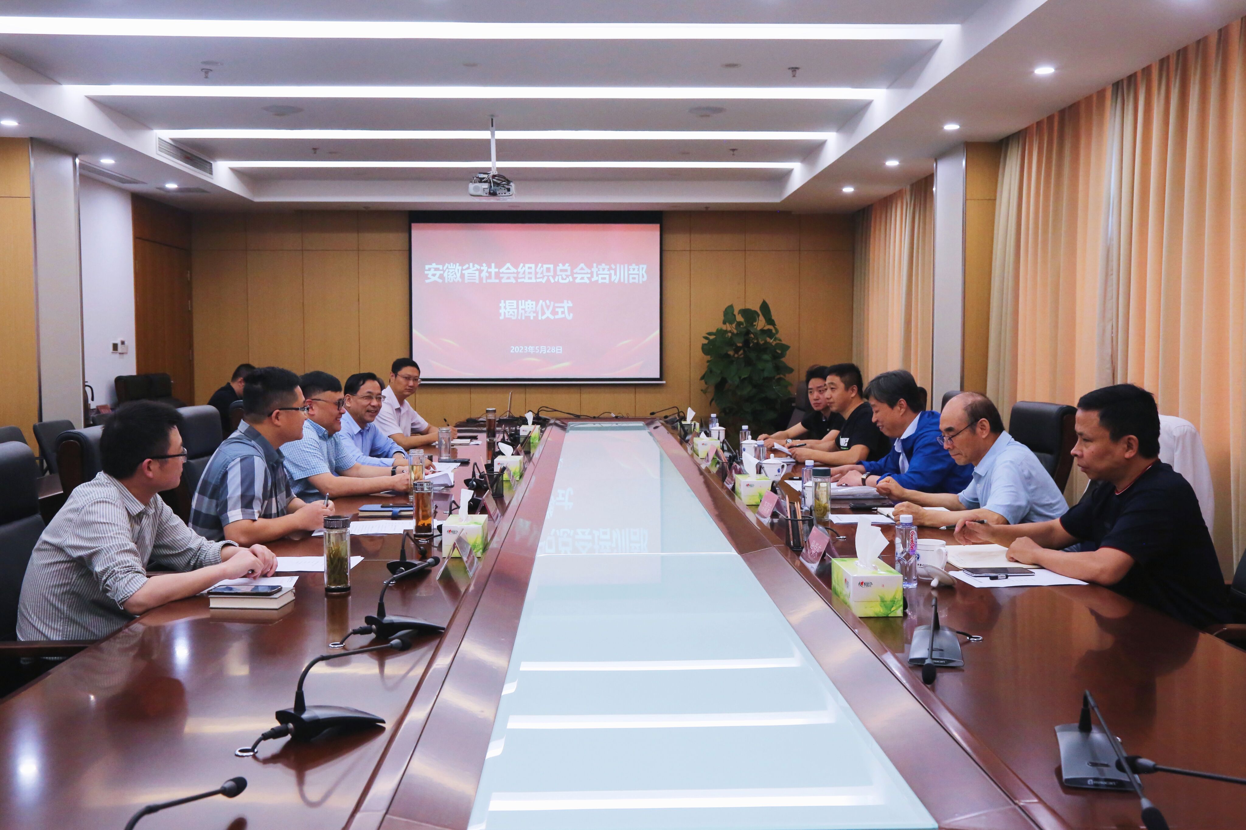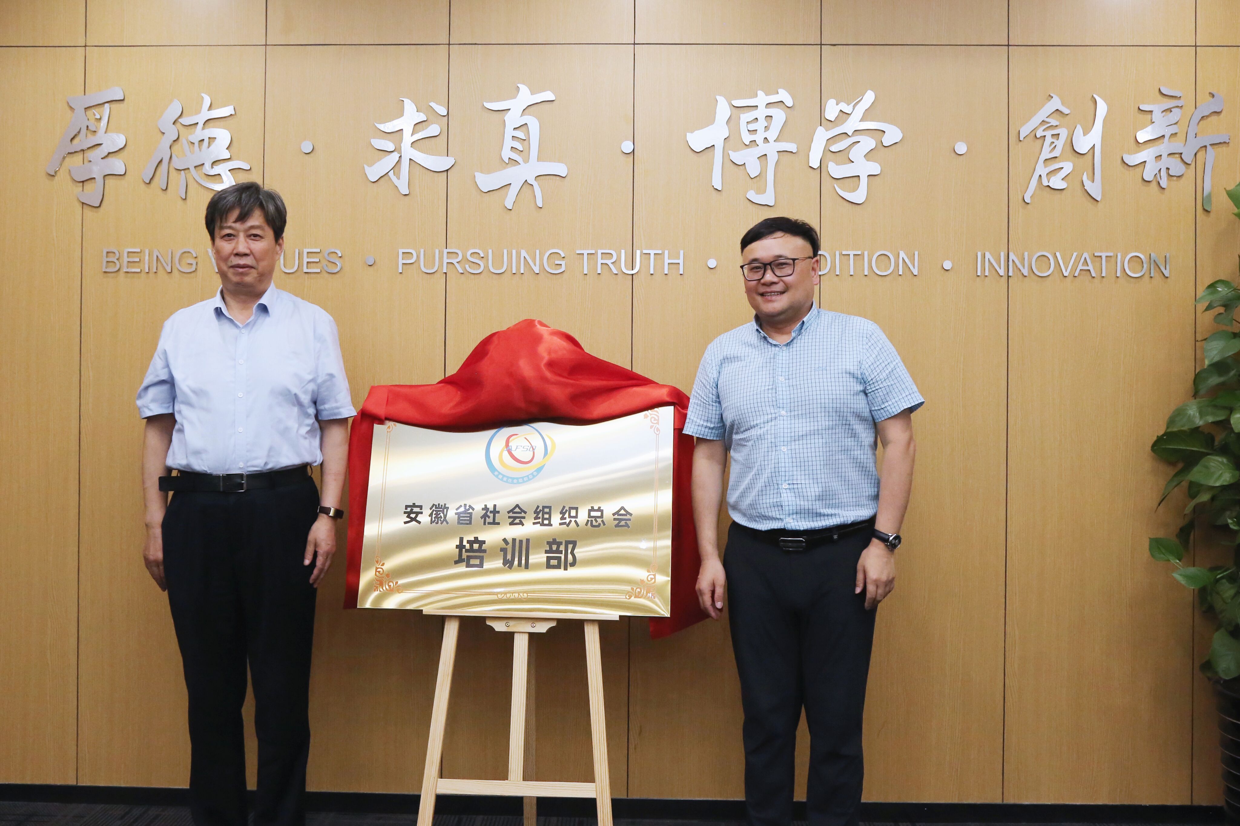 贾宝明、王孝武分别代表安徽省社会组织总会和安徽新华学院为培训部揭牌。