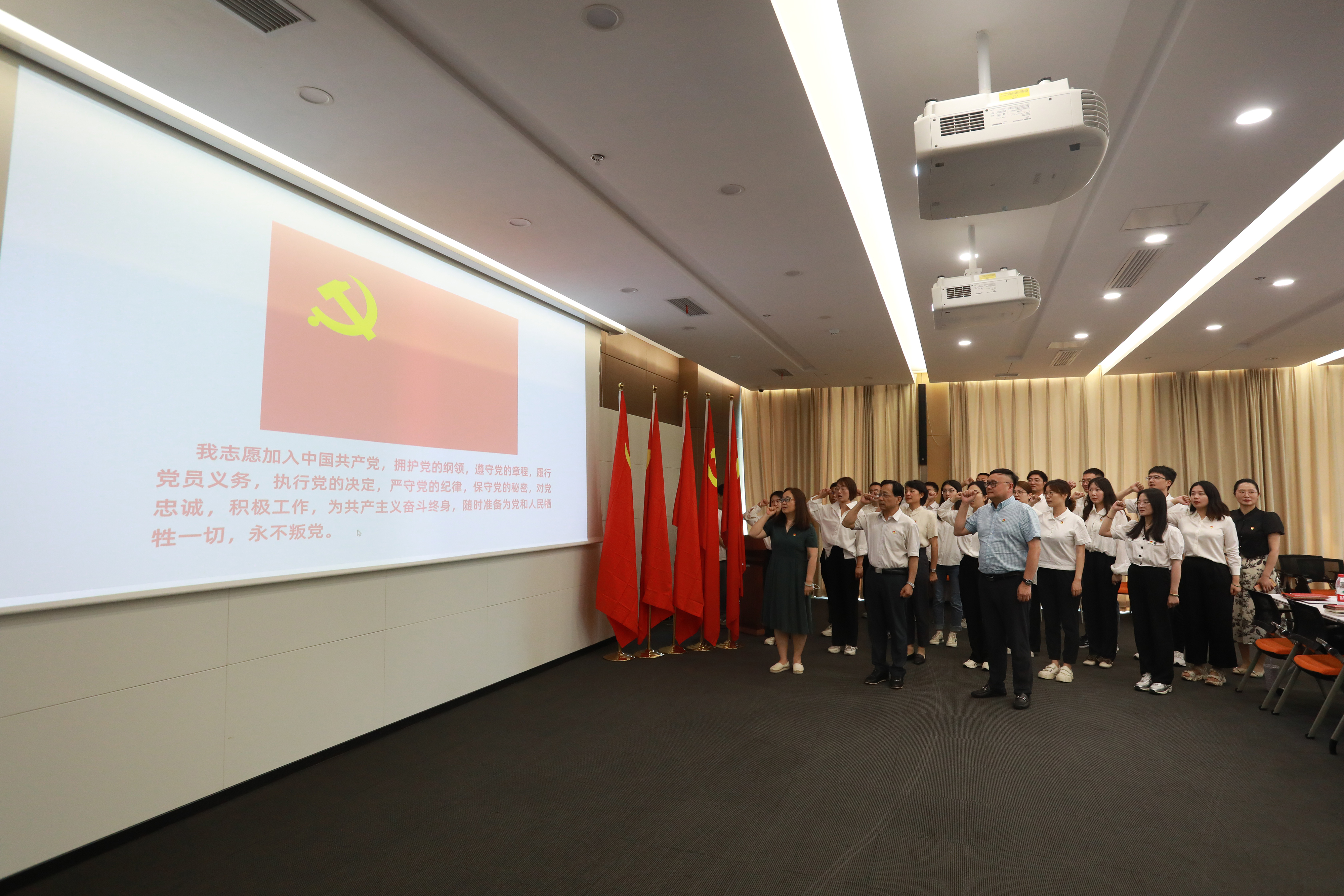 接着,与会领导为教职工预备党员现场颁发党徽、党章和党员学习记录本。最后,邸建伟带领现场预备党员进行入党宣誓,重温入党誓词,追忆入党初心,永葆党员本色。