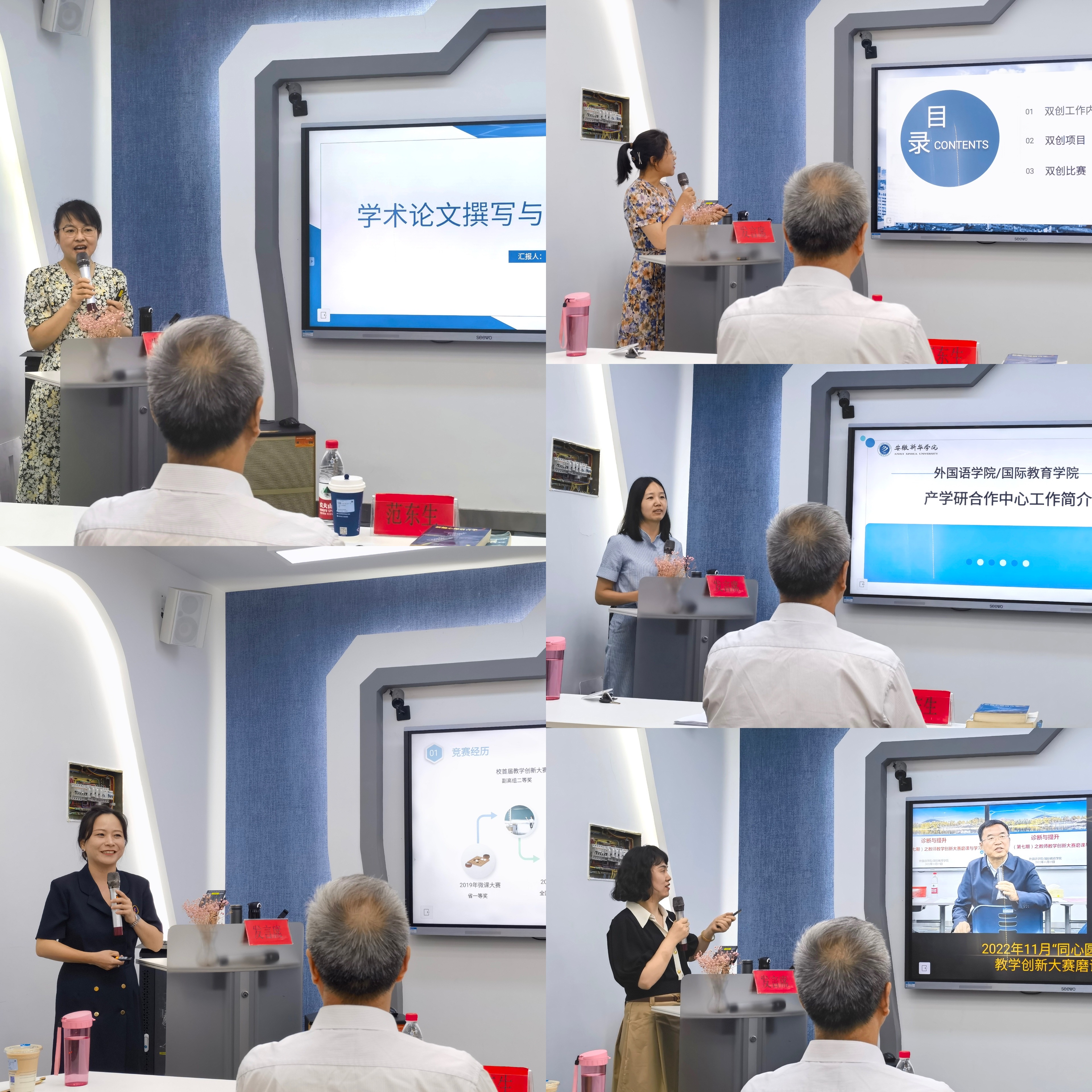 院长助理李怡嘉主持业务能力培训。科技创新中心主任佘月月从学院科研现状、科研工作管理办法、教科研项目申报介绍及科研工作发展计划四个方面解读“科技创新中心”重点工作。学科竞赛管理中心主任柳飏从学科竞赛概览及竞赛工作详解两个方面解读“学科竞赛管理中心”重点工作。双创中心主任周晶从双创工作内容简介、双创项目及双创比赛三个方面解读“双创”重点工作。校企合作管理中心主任黄亚萌从产学研工作的政策背景、产学研工作内容、产学研工作成果及工作建议四个方面解读“校企合作管理中心”重点工作。教师发展中心主任张丽从青年教师导师制工作、教学竞赛管理工作及教师专业素养提升工程三个方面解读“教师发展中心”重点工作。李静副教授从竞赛经历、教学设计、教学反思、案例分析及讨论四个方面分享教学竞赛经验。金怀梅教授从论文、摘要、关键词、正文、投稿五个方面进行教科研论文撰写与发表经验分享。