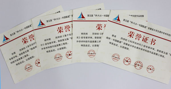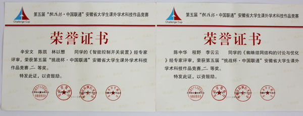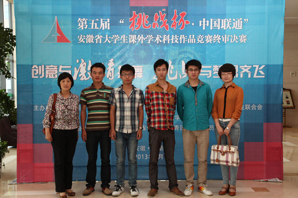 本网讯(王海峰)由共青团安徽省委员会、安徽省教育厅、安徽科学技术协会、安徽省学生联合会共同主办的第五届“挑战杯”安徽省大学生课外学术科技作品竞赛终审决赛6月1日至3日在安徽师范大学举行,我校选送的6件作品获二等奖2项,三等奖4项,获奖数量和级别均创历史最好成绩。