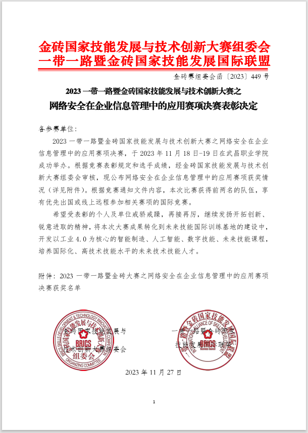 本网讯(通讯员:齐晓霞)11月18日至20日,2023一带一路暨金砖国家技能发展与技术创新大赛网络安全在企业信息管理中的应用赛项全国总决赛在武昌职业技术学院开启,来自全国100所高校的学子齐聚武汉,逐梦赛场。经过激烈角逐,由我校齐晓霞、楼建宇老师指导的学生获得全国总决赛一等奖和三等奖,并以总分第二名本科组第一名的好成绩,拿到出国参加相关赛项国际竞赛的名额。这也是我校在该项赛事的一重大突破。