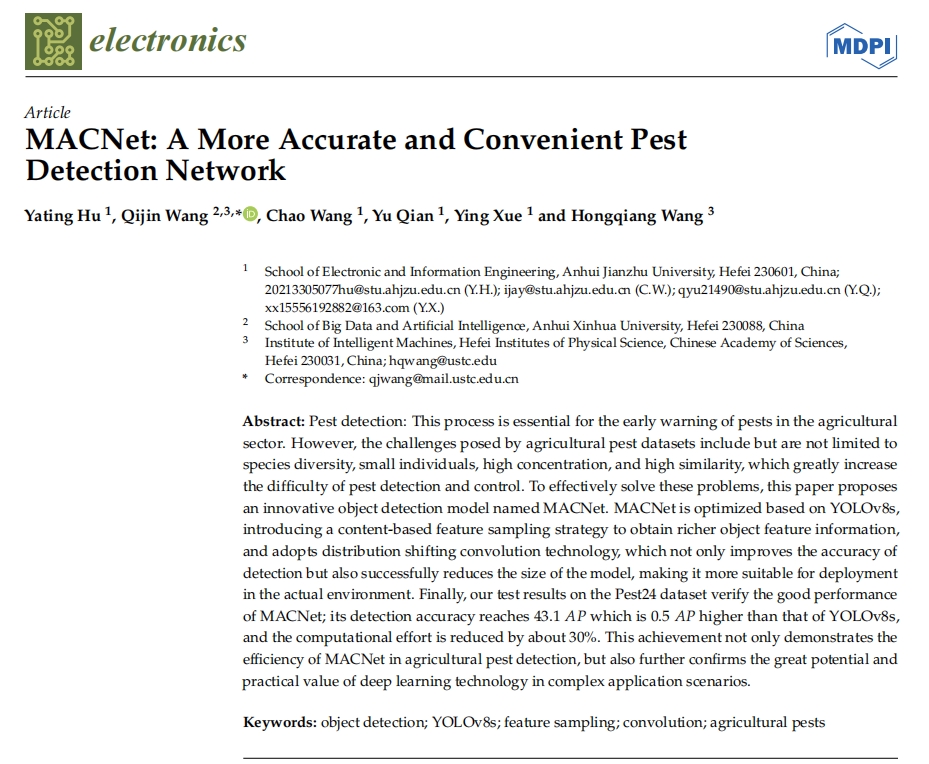本网讯(通讯员:刘慧)近日,我校人工智能目标检测研究团队王琦进教授的2021级硕士研究生胡雅婷以第一作者在SCI期刊《Electronics》在线发表了题为“MACNet: A More Accurate and Convenient Pest Detection Network”的研究论文(论文链接:https://doi.org/10.3390/electronics13061068)。据悉《Electronics》是国际知名期刊,JCR二区。
