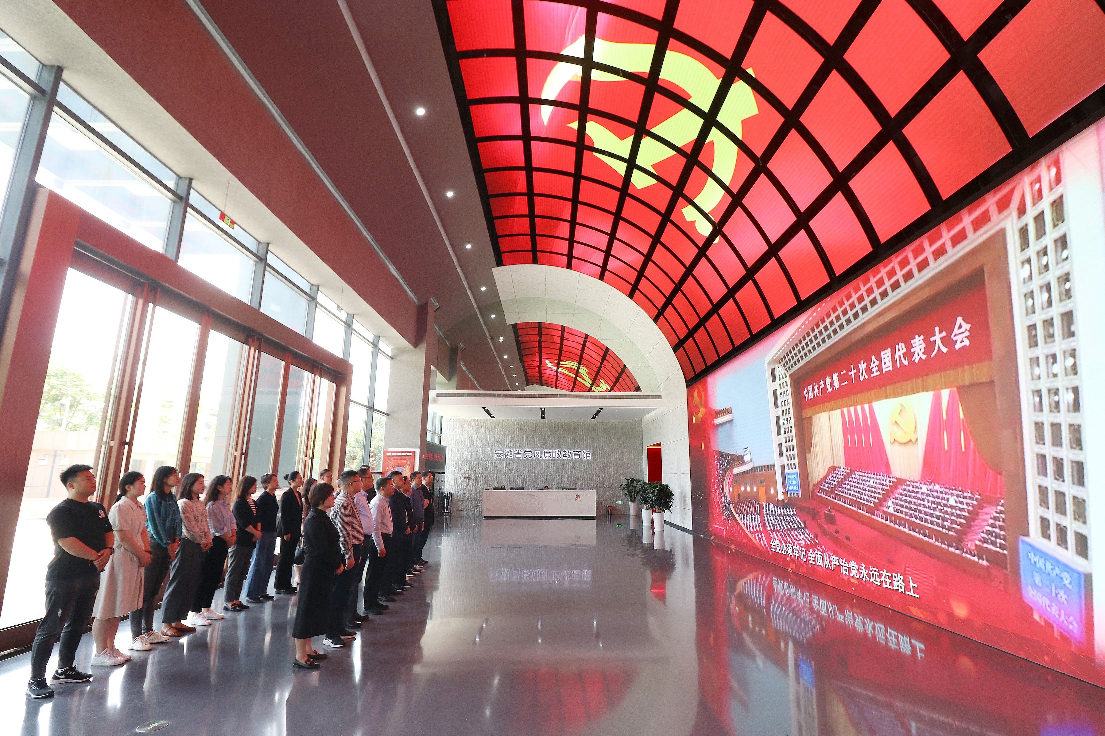 在讲解员的带领下,大家在序厅驻足观看了《永远在路上》专题纪录片,依次参观了“纪律立党·从严治党”“廉润江淮·清风扬帆”“以案为鉴·警钟长鸣”“不忘初心·永葆清廉”四个展厅。通过观看展板、视频播放、互动查询、场景还原、沉浸式教育等方式,系统回顾了中国共产党筚路蓝缕的百年纪律建设史、深刻了解了安徽省全面从严治党、党风廉政建设和反腐败斗争成果。