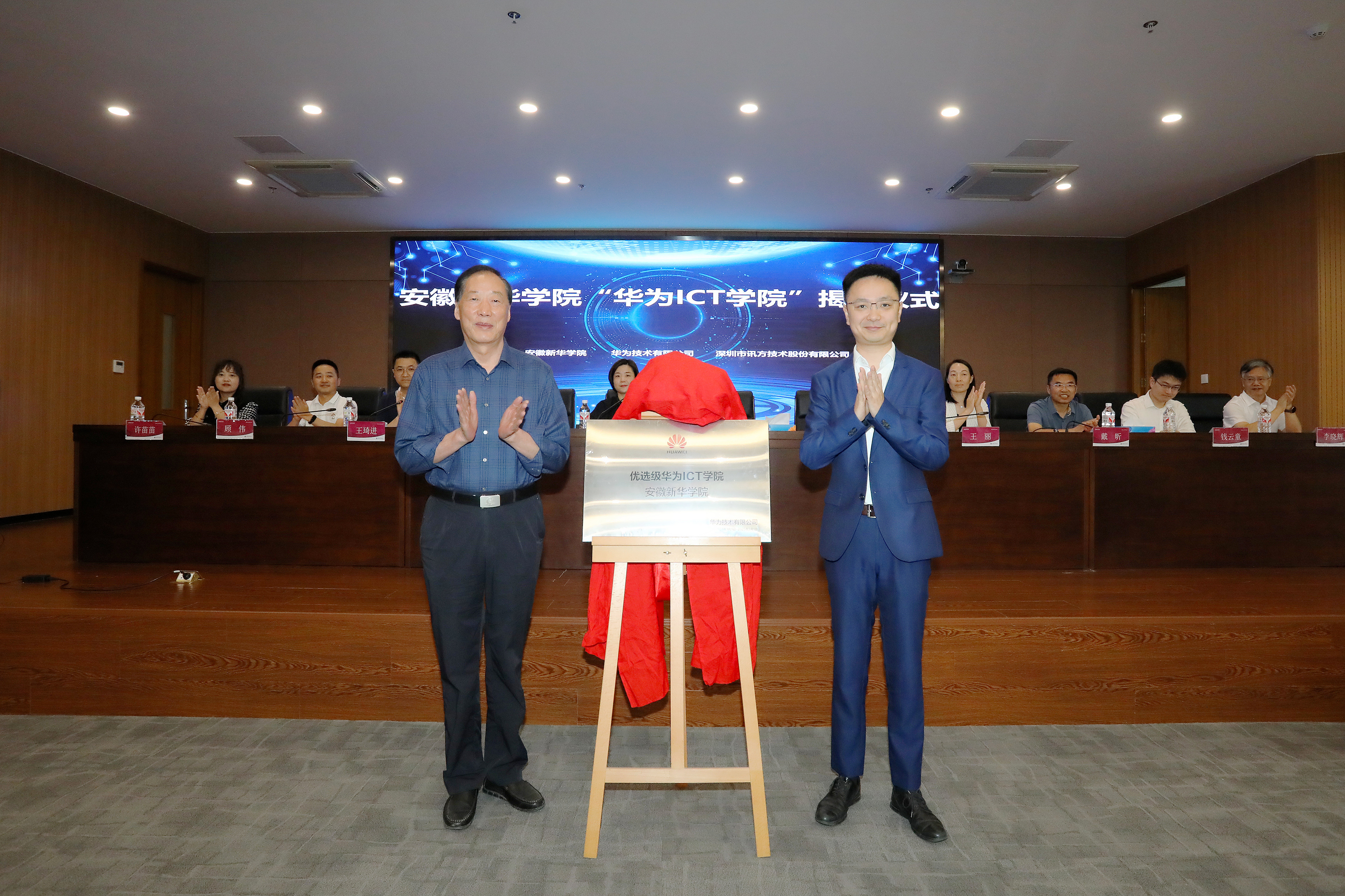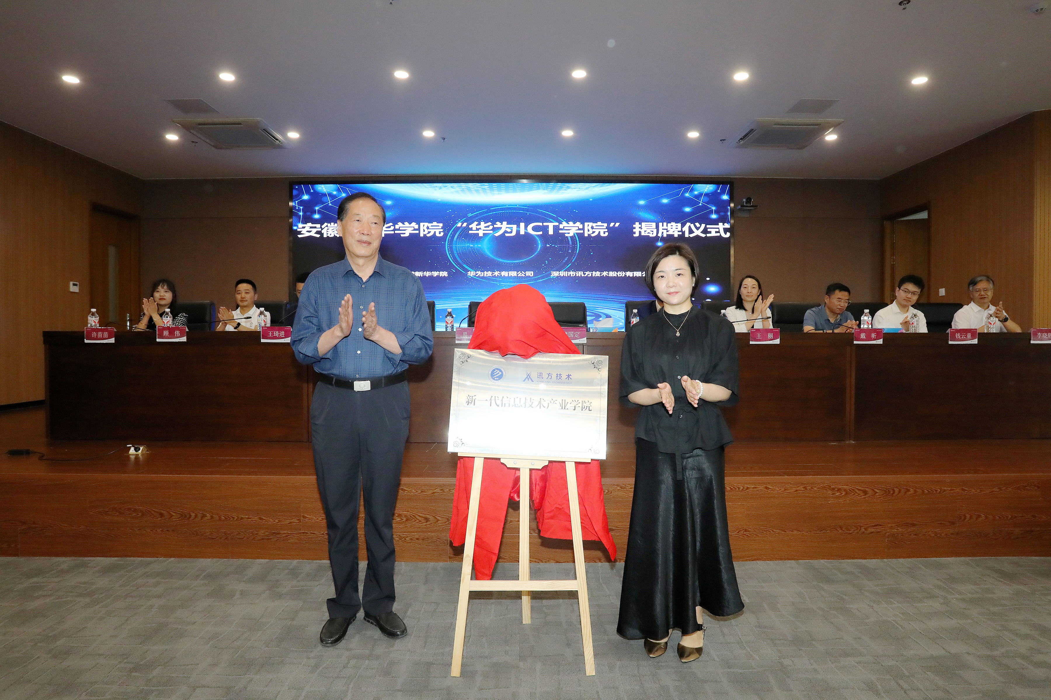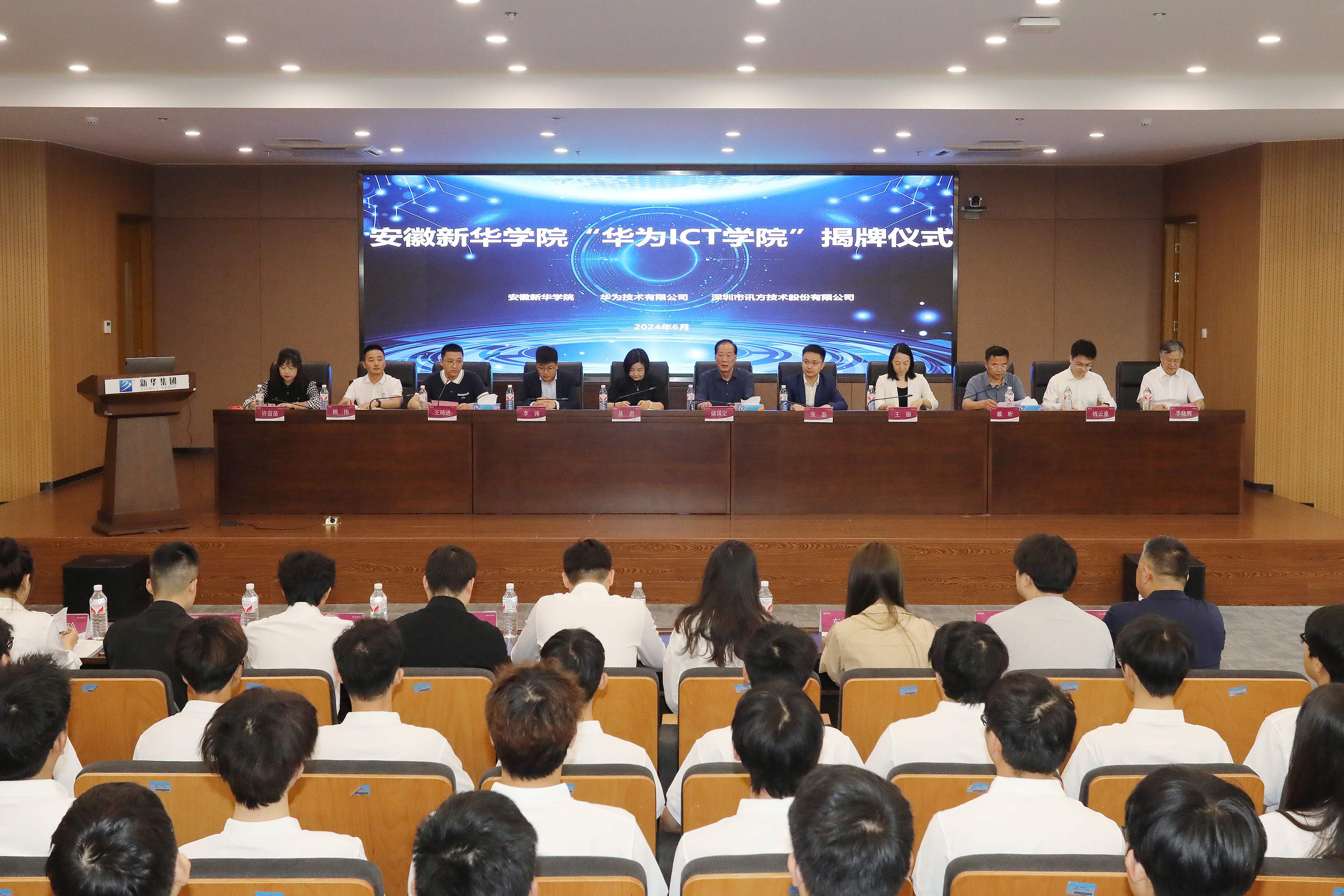 本网讯(通讯员:孙美玲)6月5日,安徽新华学院电子工程学院/智能制造学院在科研楼多功能厅举行了“华为ICT学院”暨新一代信息技术产业学院揭牌仪式。安徽新华学院董事长储国定、常务副校长王丽、副校长戴昕、校长助理王琦进;华为安徽产业发展与生态部总经理张磊、华为安徽政企业务部合肥教育总经理李涛、华为合肥昇腾人工智能生态创新中心运营总监钱云童;深圳市讯方技术股份有限公司华中片区总经理易君、安徽省区总监顾伟;电子工程学院/智能制造学院院长李晓辉、执行院长许苗苗等教职工、学生代表,以及华为和讯方相关部门负责人和工程师出席了会议。