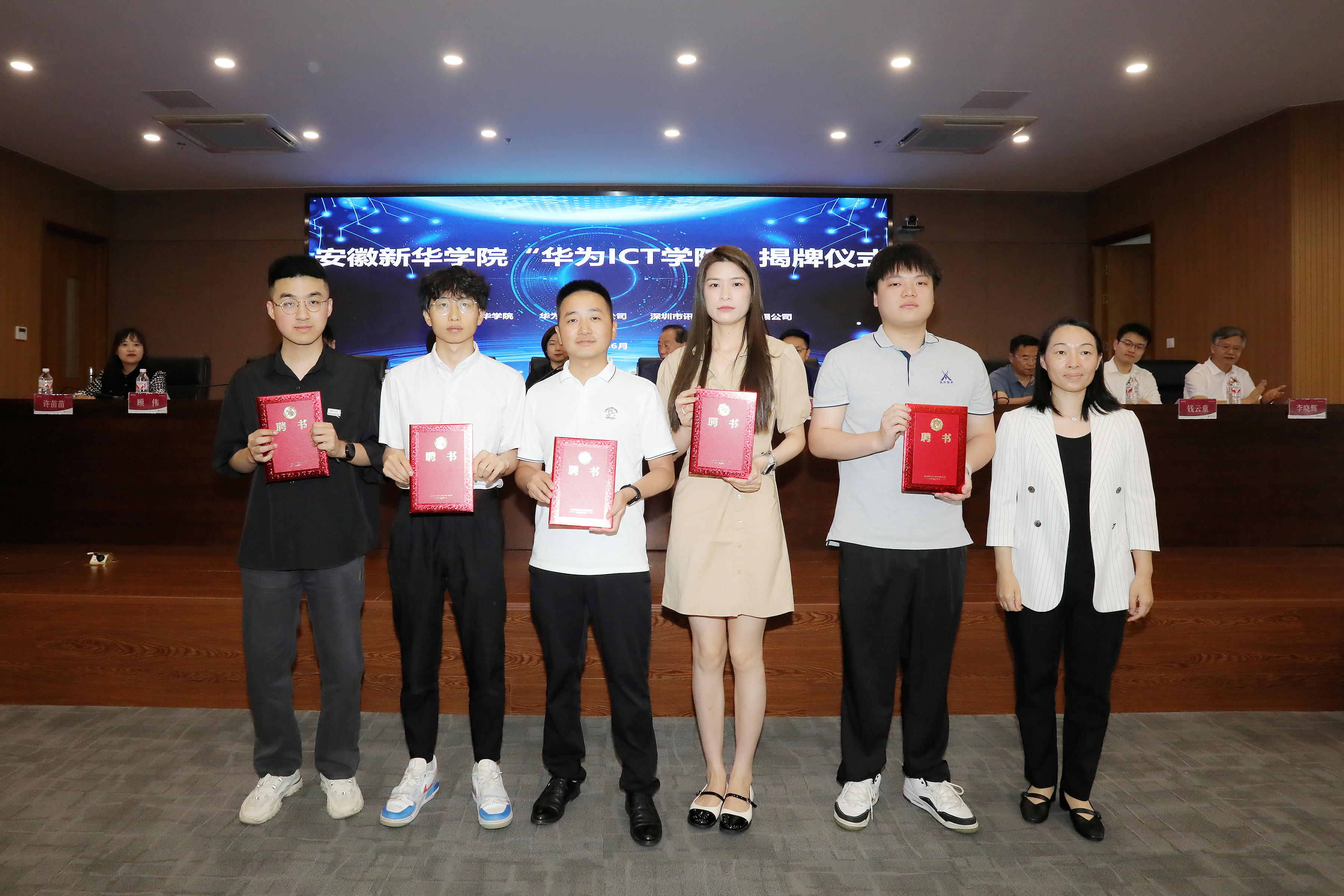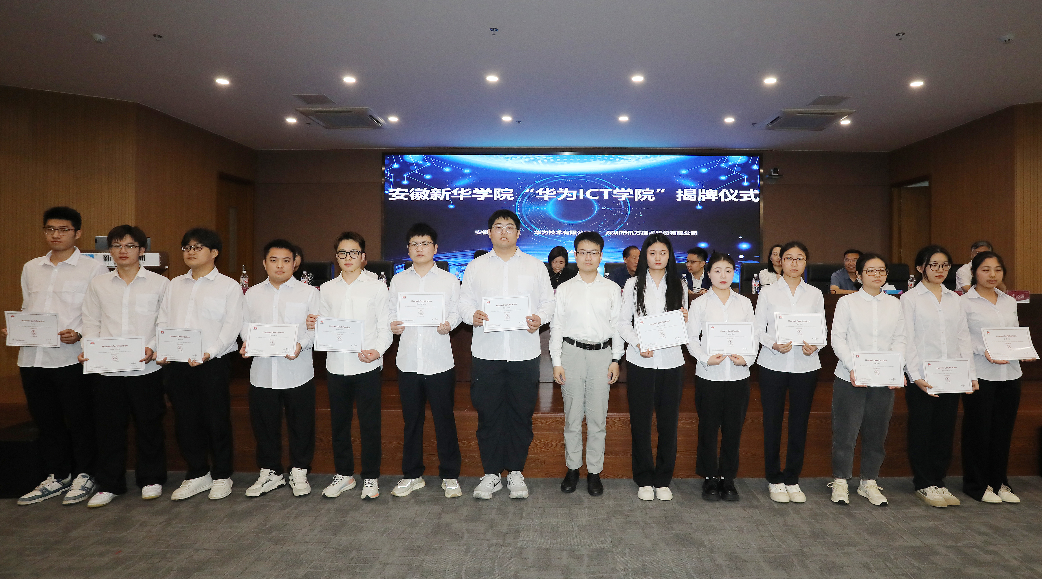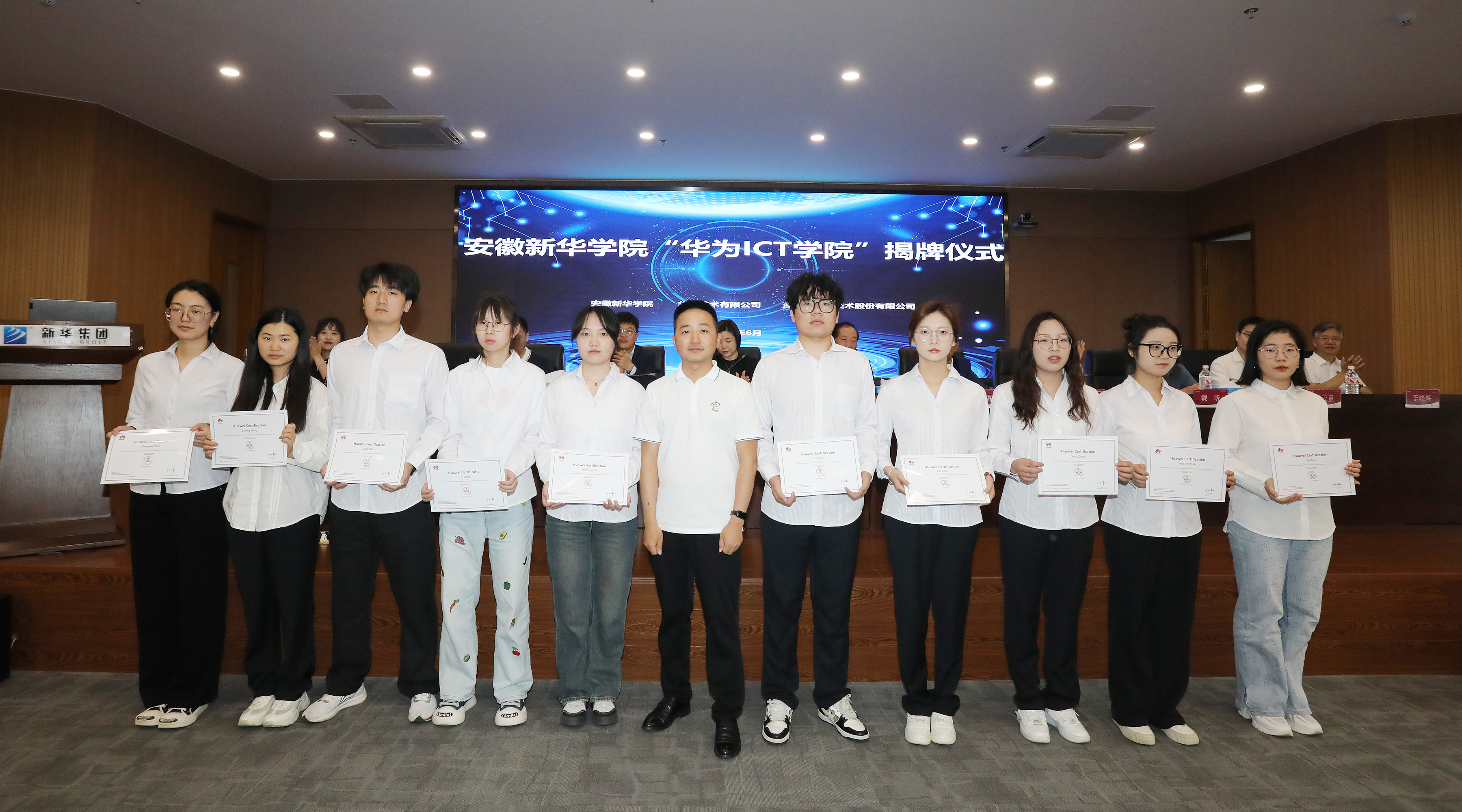 本网讯(通讯员:孙美玲)6月5日,安徽新华学院电子工程学院/智能制造学院在科研楼多功能厅举行了“华为ICT学院”暨新一代信息技术产业学院揭牌仪式。安徽新华学院董事长储国定、常务副校长王丽、副校长戴昕、校长助理王琦进;华为安徽产业发展与生态部总经理张磊、华为安徽政企业务部合肥教育总经理李涛、华为合肥昇腾人工智能生态创新中心运营总监钱云童;深圳市讯方技术股份有限公司华中片区总经理易君、安徽省区总监顾伟;电子工程学院/智能制造学院院长李晓辉、执行院长许苗苗等教职工、学生代表,以及华为和讯方相关部门负责人和工程师出席了会议。