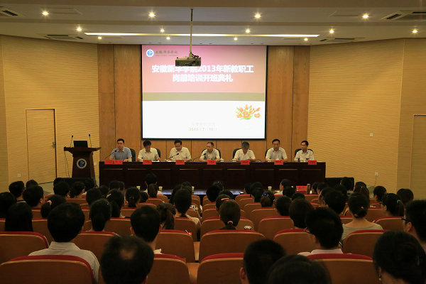 本网讯(李军)7月16日上午,我校2013年新教职工岗前培训班开班典礼在学术报告厅举行,集团公司领导,校领导胡昭林、石秀和、杨世国、马凤余、袁种宝、倪征出席典礼。