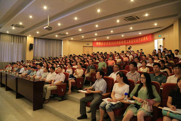 典礼由副院长倪征主持。人事处处长杨成华首先简要汇报了我校2013年招聘工作与新教职工岗前培训安排情况。招生就业办公室的祝俭同志代表新教职工发言,他以自己入职三个月来的所见、所感、所悟为出发点,表达了自己服务地方经济、融入学校、承担教育使命的信心与勇气。商学院院长孙太清教授希望青年教师要从传统文化中汲取精华,爱岗敬业,注重师德培养,不断创新人才培养模式,快速融入新华文化。