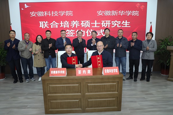 本网讯(通讯员:蒋亚龙) 11月5日上午,我校与安徽科技学院联合培养硕士研究生签约仪式在安徽科技学院图书馆二楼会议室举行。安徽科技学院党委副书记、校长李升和,副校长王孝义;新华集团副总裁、安徽新华学院董事长王孝武,校长赵良庆,副校长戴昕,副校长王琦进,以及双方相关部门负责人参加签约仪式。戴昕和王孝义代表各自学校,在协议书上签字。