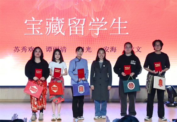王丽为“宝藏留学生”颁发荣誉证书及奖品,这些留学生在学术、文化、社交活动等多个维度都有着突出贡献和优秀表现,是校园里的闪耀之星。