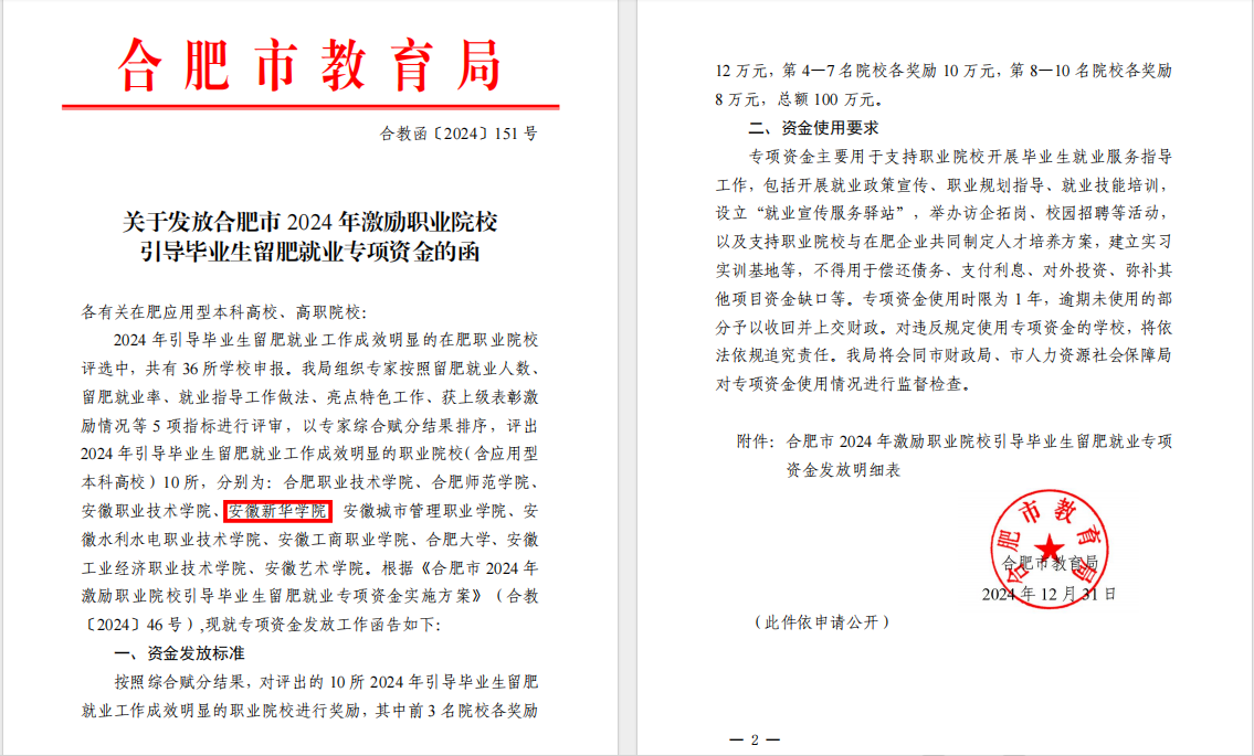 喜报!我校获合肥市2024年引导毕业生留肥就业专项资金激励