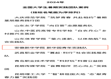 本网讯(通讯员:张安娜)近日,《中国青年报》举办的“2024年第十届全国大学生暑期实践展示活动”名单揭晓,安徽新华学院新华园青年实践队从全国三千余支参赛团队中脱颖而出,荣膺“全国大学生暑期实践团队TOP100”称号,并成为安徽省唯一蝉联此殊荣的高校。