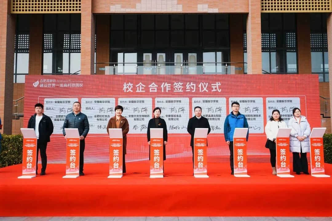 本次活动是落实“人才强区”战略的重要举措,通过党建引领凝聚合力,为高校毕业生与企业搭建精准对接桥梁。安徽新华学院副校长王琦进在致辞中指出,希望通过此次活动,能够实现政校企三方联动,精准对接学生的就业需求,共同服务、促进经济社会发展。现场还聘任了10名优秀学子担任高新区首批“青春推介官”,他们将以青年视角为城市发展代言,助力人才政策宣传。我校与贝克生物、青松食品、晶澳太阳能等七家重点企业签署校企合作协议,深化产教融合,共育高素质技能人才。