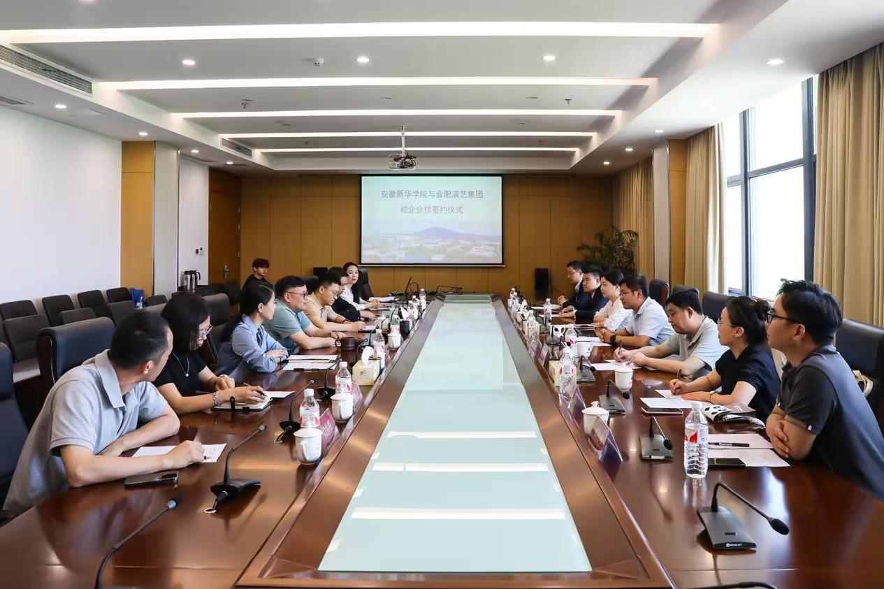 校企合作签约仪式在安徽新华学院举行。合肥演艺集团党委书记、董事长赵斌,党委委员、副总经理魏琪,党群部副部长李玮,战略发展与品牌推广部副部长戴璐,合肥曲艺团副团长(主持)孙铭泽,合肥演艺股份有限公司副总经理(主持)张兆峰,合肥大剧院副总经理张豪浩;新华集团副总裁、安徽新华学院董事长王孝武,副校长王琦进,艺术学院执行院长许存福,文化与传媒学院执行院长洪玉等共同出席了签约仪式。