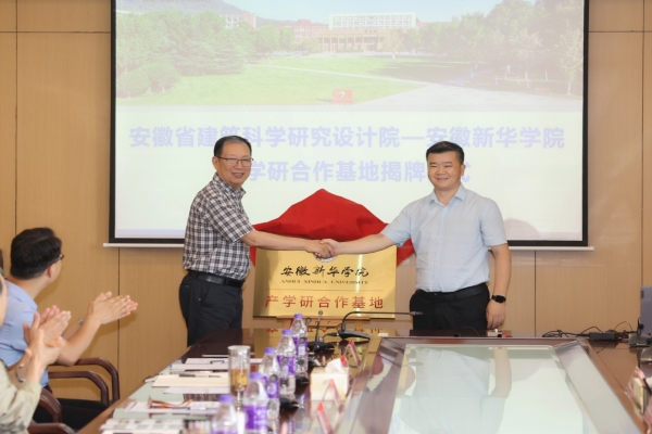 安徽省建科院党委副书记、院长刘春雷与安徽新华学院校长赵良庆共同为产学研合作基地揭牌。随着红绸缓缓落下,产学研合作基地正式成立,这不仅是双方合作的重要里程碑,更是双方携手共进、共谋发展的新起点。