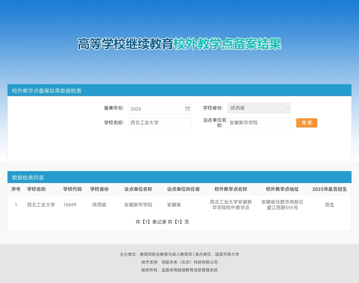 本网讯(通讯员:孙马莉)近日,安徽省教育厅印发《安徽省教育厅关于转发教育部2025年高等学历继续教育拟招生专业备案结果和校外教学点设置备案结果的通知》皖教秘高〔2025〕82号。我校积极按要求申报,经西北工业大学、合肥市教育局实地考察,安徽省教育厅专家评议、教育部备案,我校成功获批西北工业大学高等学历继续教育校外教学点。2025年,西北工业大学安徽新华学院校外教学点正式招生,开设机械设计制造及其自动化、计算机科学与技术、电气工程及其自动化、工商管理、法学等5个专升本(非脱产)专业。