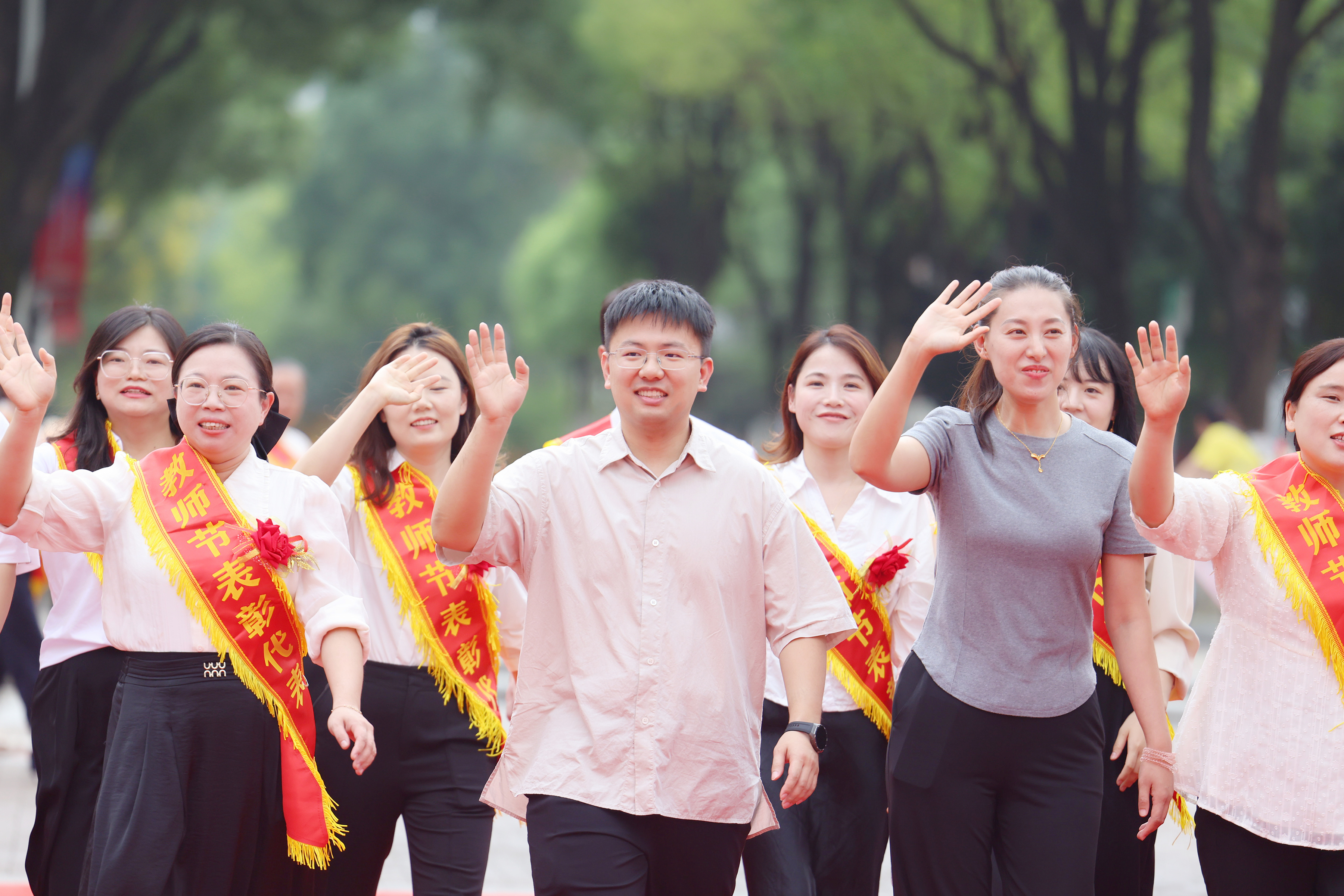 下午1点,蜀麓广场气氛热烈,红毯“走秀”环节拉开了表彰大会的序幕。受表彰的教师们迈着自信从容的步伐,在师生们热烈的掌声和欢呼声中走过红毯,在签名墙前签名留念。
