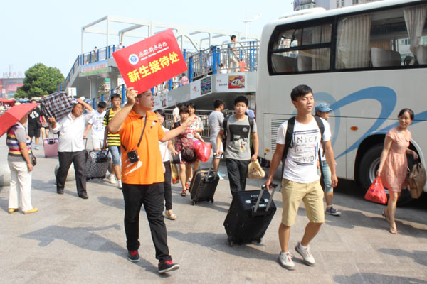 为了全方位地做好迎新工作,我校志愿者主要分为校外和校内两组,一组在各大车站迎接远道而来的新生,另一组在校内为新生报到做各方面的引导。8月31日早晨6点多,负责在车站迎新的志愿者就跟随着第一班次的校车,来到各大车站迎接新生。志愿者一下车就举着“新生接待处”的牌子,等到新生来后,引导他们顺利走进校车。志愿者需要在一直车站工作,直到下午接完当天的新生为止。下午5点多,校学生会的石宇和他所带领的迎新队伍回到学校,结束了当天在长途汽车站的迎新工作。他觉得车站迎新最大的困难就是干事主要是大二的学生,首次迎新,缺乏经验,导致开始时工作进行比较困难,但是后来经过调节,工作地比较顺利。