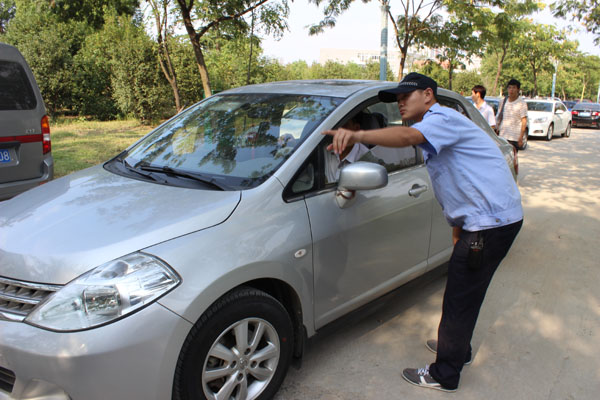 “不好意思,这边道路比较拥挤,请从那边绕行,谢谢合作!”8月31号下午三点多,护卫队队长孙良乐正在外国语学院旁的十字路口进行道路疏通。孙良乐说由于护校队人员较少,而今天校内大约有一千五百余辆车出入,交通较为拥堵,所以人手不够,要按照需要调换人员。他本来在其他地方指挥,但因为这个路口此时很繁忙,临时调过来帮忙。