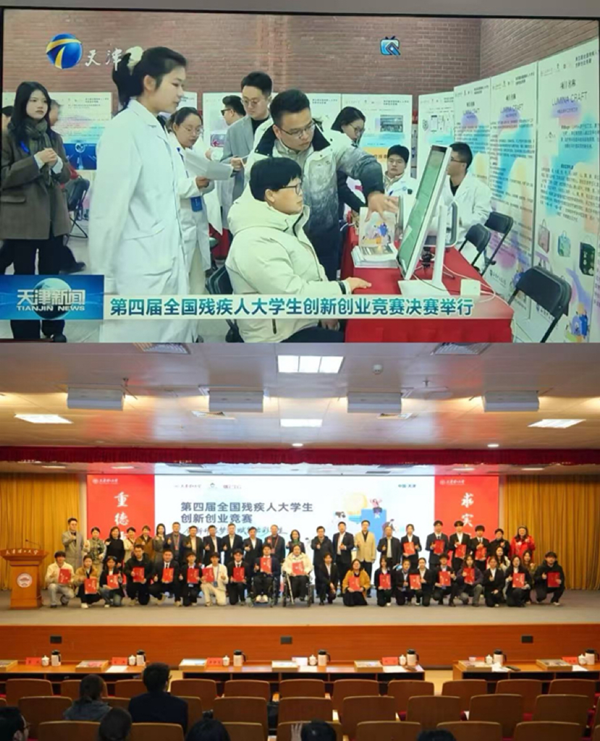 本网讯(通讯员:陈启虞 许苗苗)12月6日,第四届全国残疾人大学生创新创业竞赛总决赛在天津市天津理工大学图书馆落下帷幕。由我校创新创业学院主管陈启虞、文化与传媒学院辅导员赵群带领在校学生张志伟、施诗、王康缘、周欣宇、任泉、化仁杰、周婧一行9人赴津参赛,最终斩获全国本科组二等奖一项、三等奖一项,成为省内唯一在该赛事本科组获奖的高校。天津电视台对本届大赛进行了特别报道。