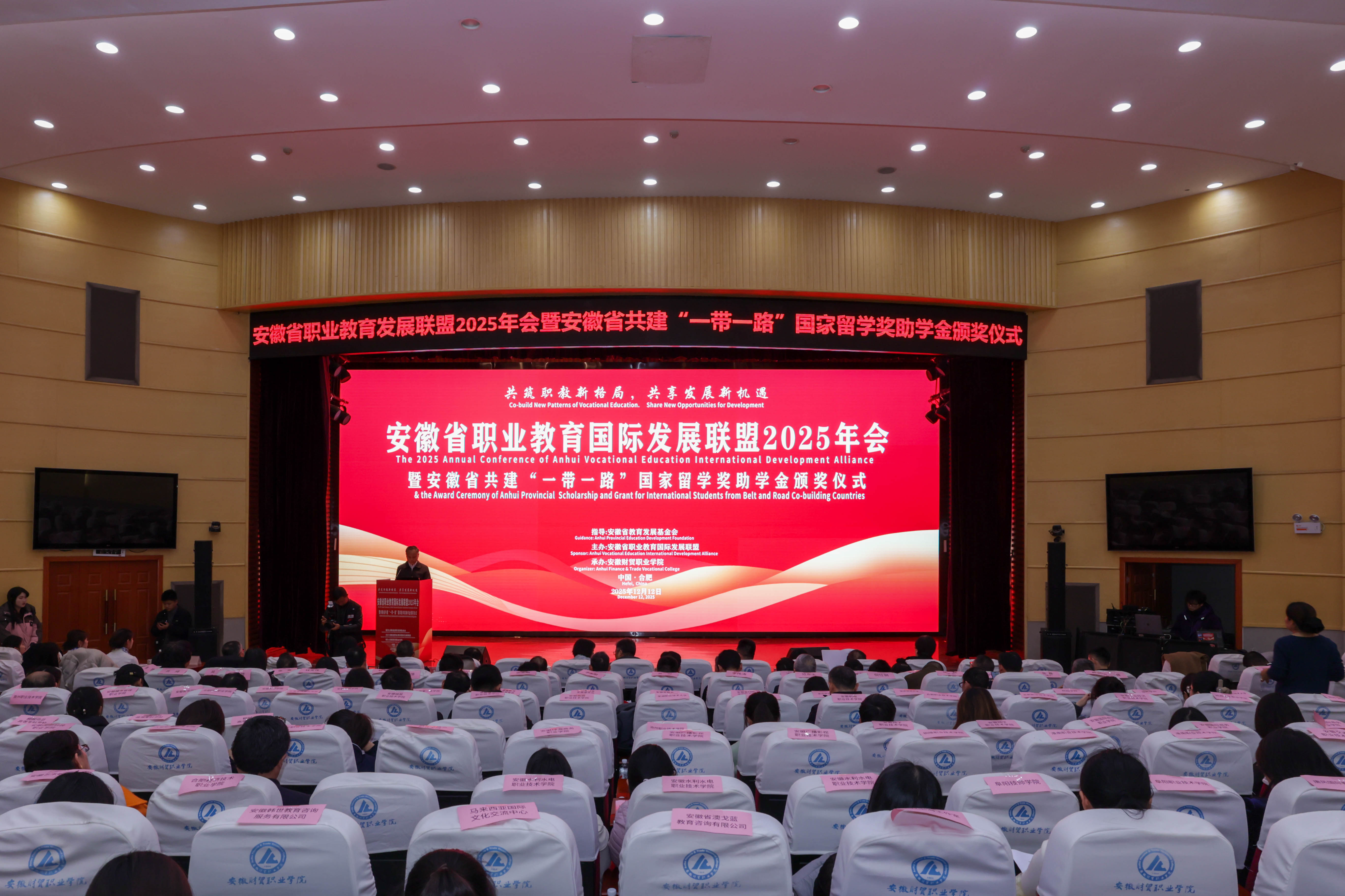 本网讯(通讯员:凌青霞)近日,安徽省职业教育国际发展联盟2025年会暨安徽共建“一带一路”国家留学奖学金颁奖典礼在安徽财贸职业学院报告厅成功举办。安徽新华学院10名优秀来皖留学生凭借其出色的学业表现和良好的综合素质,荣获本年度安徽共建“一带一路”国家留学奖学金。安徽新华学院副校长贺行佳、国际教育学院院长范东生参加联盟年会并出席颁奖典礼。