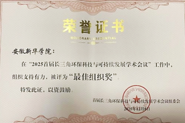 本网讯(通讯员:方馨梅)2025年11月21日至23日,以“聚焦前沿·绿动未来”为主题的首届长三角环保科技与可持续发展学术会议在合肥隆重举行。安徽新华学院作为承办单位参与会议筹备,并荣获“最佳组织奖”。
