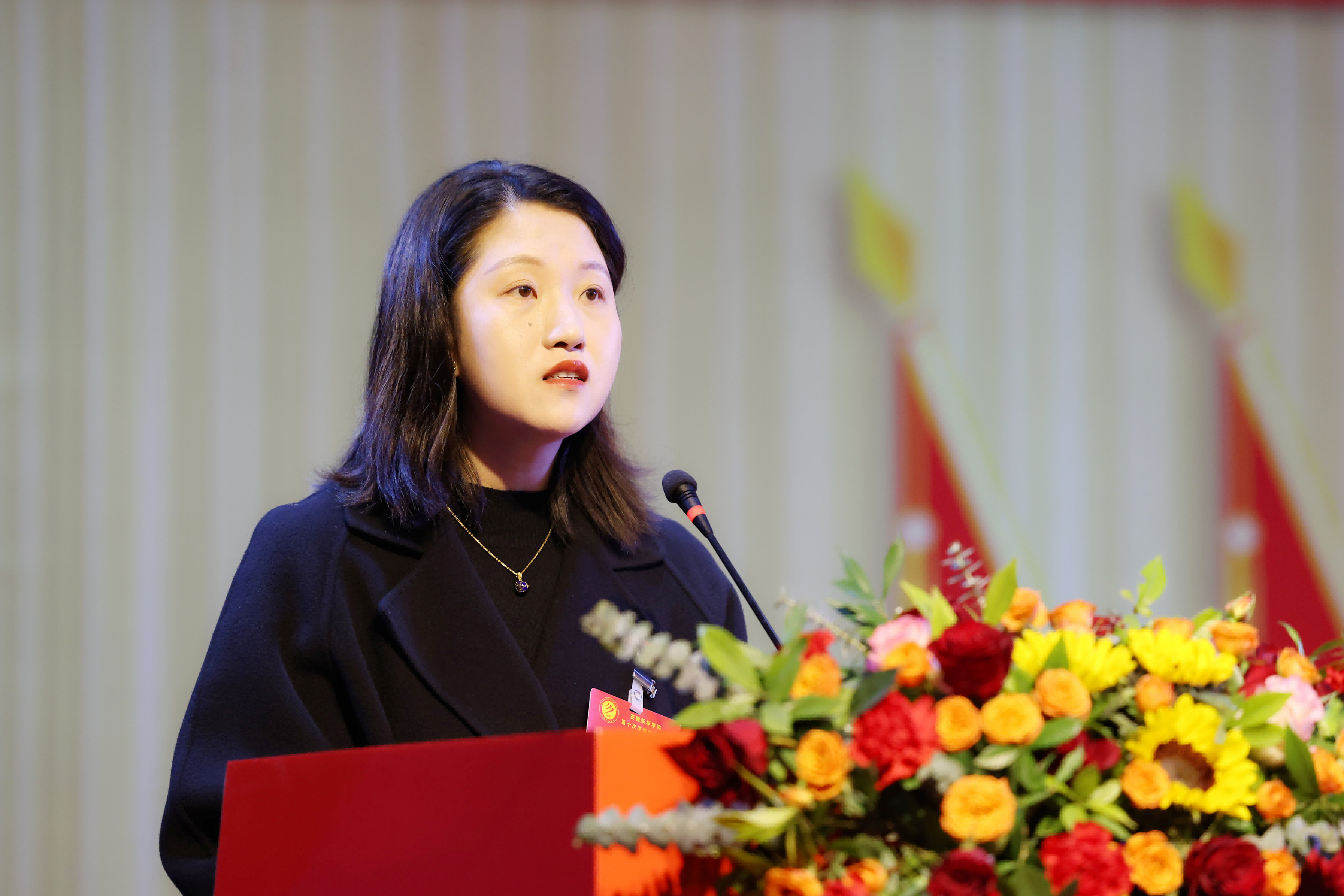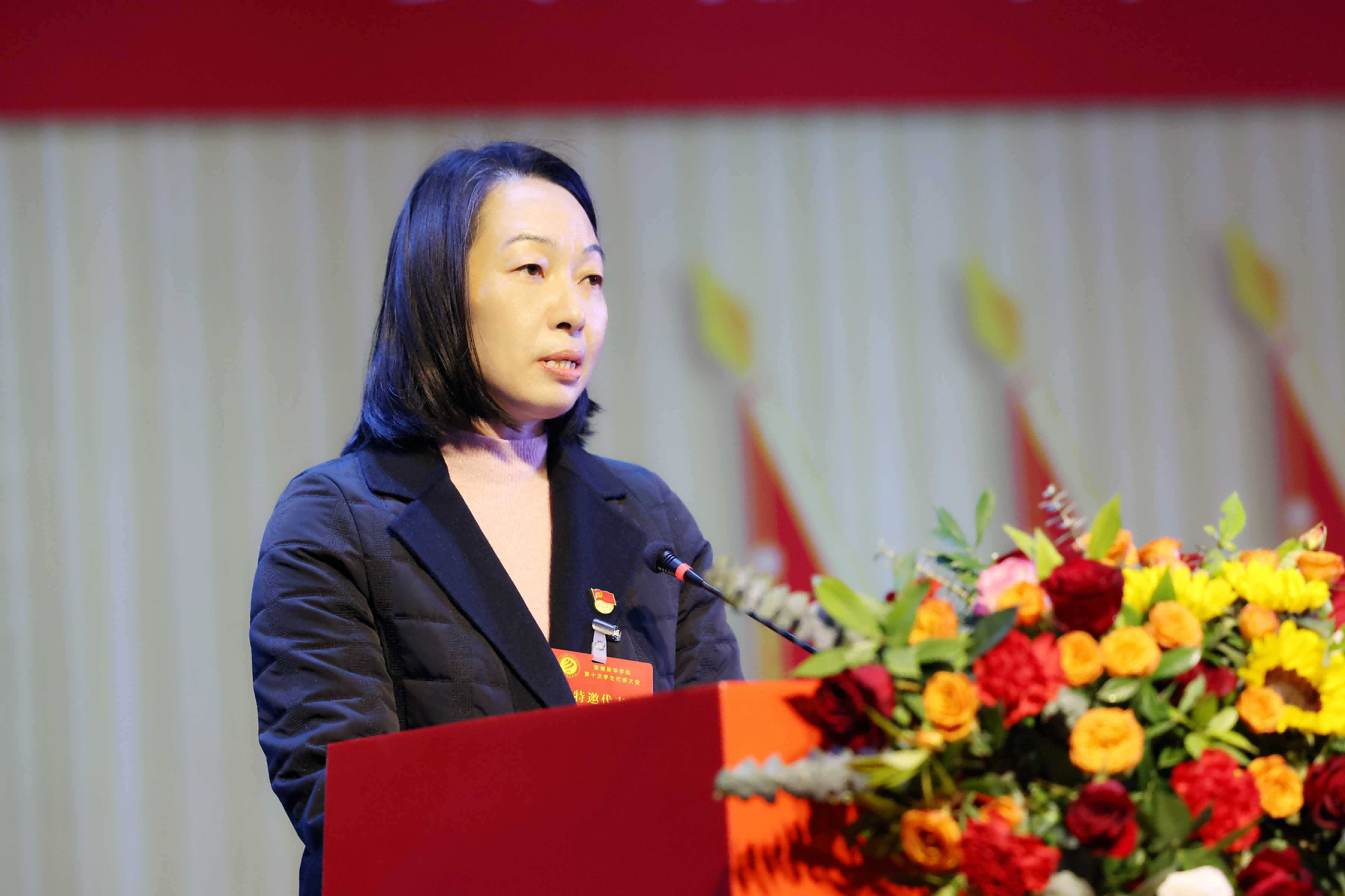 汤佳慧代表安徽省学生联合会致辞。她对大会的召开表示祝贺,并对安徽新华学院学生会在思想引领、组织建设、服务同学等方面取得的成效给予高度评价。她希望各级学生会组织持续深化改革,强化服务意识,团结带领广大同学坚定不移听党话、跟党走,在全面建设社会主义现代化国家的火热实践中贡献青春力量。
