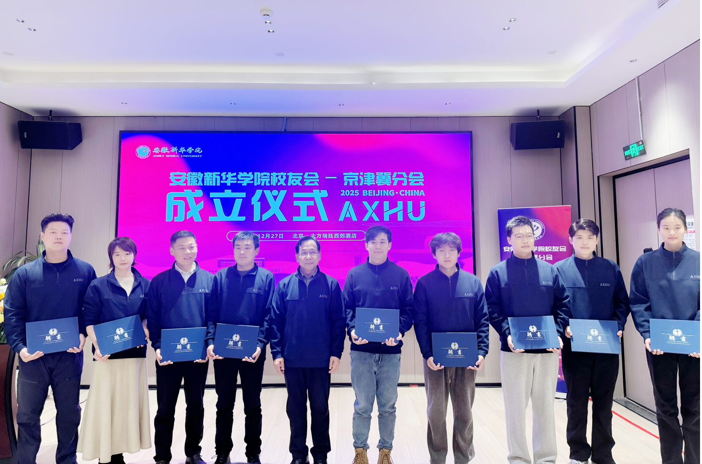 邸建伟首先宣读了《关于同意成立安徽新华学院校友会京津冀分会的批复》及首届理事会成员名单。随后,邸建伟与首任会长、2012届校友朱敏共同为“安徽新华学院校友会京津冀分会”揭牌,并向理事会成员颁发了聘书。