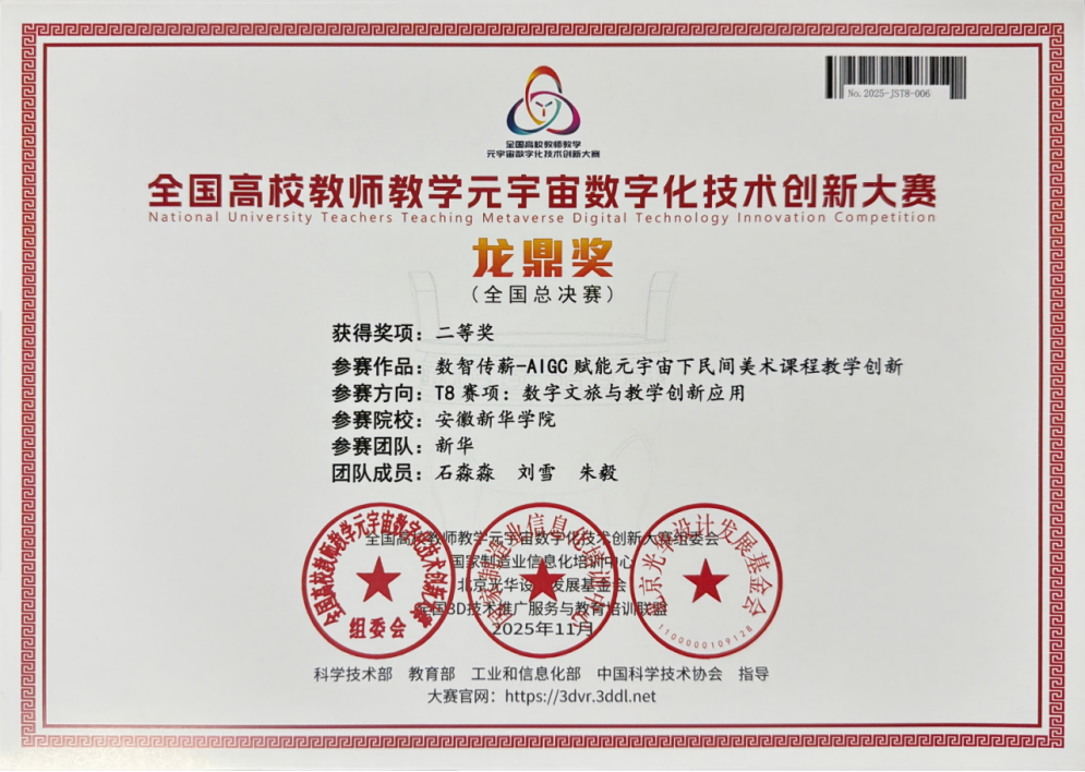 本网讯(通讯员:朱毅)近日,第六届全国高校教师教学元宇宙数字化技术创新大赛颁奖盛典在北京召开。我校文化与传媒学院石淼淼、刘雪、朱毅三位教师组成的教学团队,凭借创新的教学设计、扎实的专业功底和出色的表现,最终在高校教师组赛道中脱颖而出,荣获国家级二等奖。