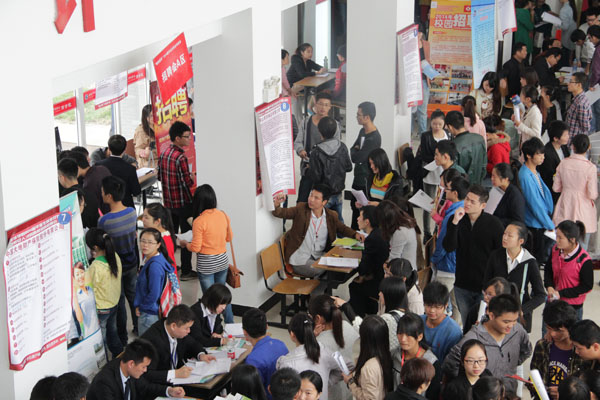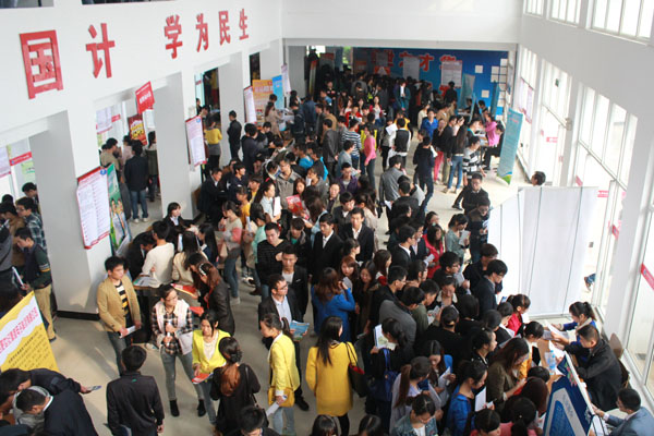 新华学院报讯(学生记者:虞甜隐、潘晓峰、董振康)为积极推动我校2014届毕业生充分就业,为应届毕业生提供更多的岗位选择,10月19日上午,安徽新华学院“相约新华”2014届毕业生就业双选会在商学院东大厅举行,本次双选会邀请了新华教育集团、中国大地财产保险股份有限公司、合富辉煌、新安人才网等80多家知名企业参加,涉及土木建筑、计算机、通信、电子、财经、外语、编辑、管理、医药、能源等不同领域,共提供了1000多个工作岗位。实力强大的招聘企业、丰富的岗位需求吸引了我校及其他高校1000余名毕业生来到现场选择合适的工作。