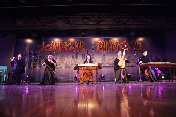 演唱会上,我校大学生艺术团的同学也带上一组精彩的表演。新规乐队动感十足的歌曲表演《曹操》带动起全场的气氛,而琵琶与电吉他、钢琴、贝司、架子鼓等乐器联合演奏的中西合璧式《十面埋伏》丝丝入扣,博得全场观众的掌声与呐喊。