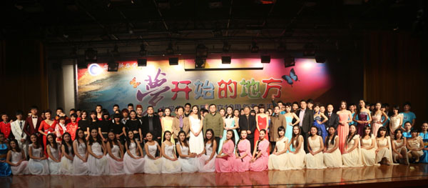 演出结束后,集团、校领导上台与演员亲切握手并合影留念。晚会圆满落幕。