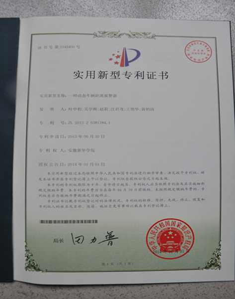 本网讯(叶中豹) 近日,由土木与环境工程学院叶中豹老师主持研发的“一种动态车辆距离报警器”,顺利通过国家实用新型专利审核,成功获批。该专利权人为安徽新华学院,权利日自2014年1月1日起,专利号为ZL201320381184.1。
