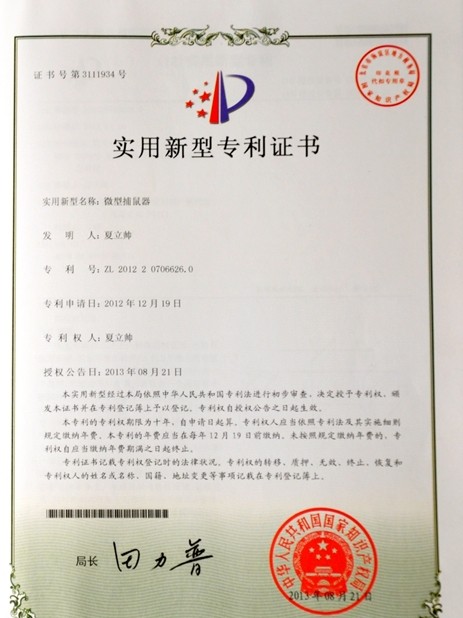 该微型捕鼠器,从外观看是一个长方体的盒子,一端开口一端封住。内部由一个斜面与盒子上端的简单“机关”组成,开口的一端与“机关”合成一个可以上下开关的门的装置,利用杠杆原理,老鼠进入后就会被封在里面,无法逃脱。使用时,在该捕鼠器内部放入诱饵,吸引老鼠前来觅食,封住的一端是无法进入的,老鼠只能从开口端进入,这时踩到内部斜面,就会触发杠杆装置,从而导致门被关上,起到了捕鼠的作用。该捕鼠器具有体积小、结构简单、造价低、无污染、无危害的特点。